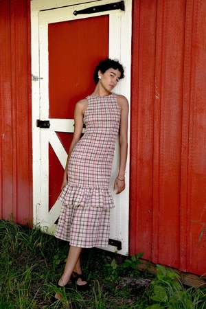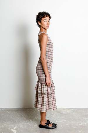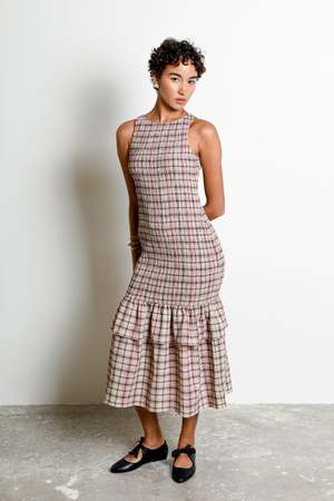 The Annie Dress is crafted from UIMs custom Petal Plaid, a cotton weave with a subtle crinkle texture. Designed with a fully smocked bodice for a flattering, comfortable fit, it is finished with a mid-length, double-ruffle silhouette and soft ruching for easy movement. Feminine, effortless, and timeless.