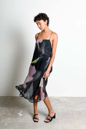 The Intermission Dress is crafted from sheer viscose organza and features UIMs custom Shadow Iris Ivory print, an oversized photographic floral. Designed in a fluid midi silhouette with a square neckline and delicate straps that cross at the back, it feels ethereal, dressy, and refined. Untitled in Motion is based in New York and is conscientious about supporting improved social, environmental, and economic practices. - 100% viscose - Ties in back.