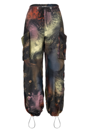 The Tambalah pant is an elegant, relaxed fitting cargo pant crafted from a luxurious TENCEL with silky twill finish. Featuring UIM custom hand painted abstract artwork Faskomilo-Multi, an easy fit with adjustable ties at the waist along with a snap and zipper closure, it can be worn from the mid to low hip for your most flattering fit. Relaxed, and baggy through the legs with slouchy side pockets and tapered hem with adjustable drawstring. A print of change and renewal. Faskomilo blooms under a low, huge moon, when the wind starts to blow chilly in the morning, and you notice night coming earlier. A last burst of heat and light before the waiting time. This product was created using Certified Sustainable Materials. - Fits true to size - Marta is 5' 10" and wearing a size Small - Adjustable drawstrings at waist - Snap and front zipper closure - Adjustable drawstrings at bottom hem - Two exposed pockets - Custom abstract print Faskomilo-Multi - Eco Dry Clean recommended or machine wash cold with like colors - 55% TENCEL Lyocell / 45% TENCEL Luxe - Vegan - Biodegradable Made from luxurious TENCEL, an innovative fabric produced from sustainable wood sources, harvested from certified and controlled sources and processed in a closed loop system to reduce water waste and toxicity. TENCEL has an extravagant, luxurious drape and is considered a superior and more durable alternative to silk.