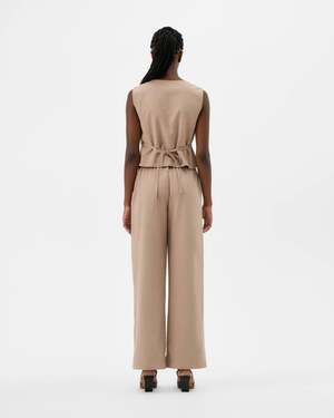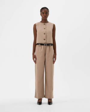 Valrie C.'s Sleeveless Jacket is an instant classic, ideal for the office and outings alike. Featuring an adjustable cord at the back for a modern waistcoat feeling and fully lined with a silky rayon for a soft and comfortable finish, this jacket is a great alternative to a blazer. Wear it buttoned or open, alone or over a shirt, turtleneck, sweater, or tee! Sizing Notes: This vest fits true to size. We recommend ordering your usual size. Please see size chart for measurements. Model is 5'10" and is wearing S. 54% Cotton, 46% Tencel (Oeko-Tex Certified) Lining: 100% Rayon (Exclusive of trim) - Fully lined with silky feeling fabric - Hits just below the waist - Removable adjustment waist cord - Matching buttons on the front Wash gently by hand, dry flat. Do not tumble dry. Iron at low temperature. Dry clean possible. Made in Quebec.