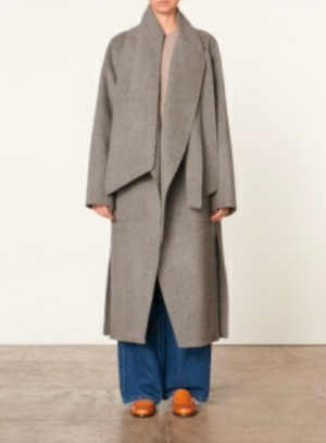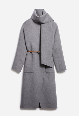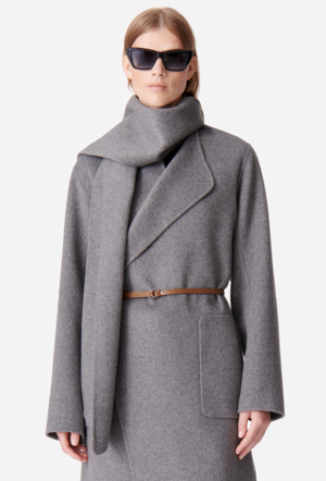 Open-front, shawl collar coat with detachable scarf. Removable belt. Double-face knit. Vents at sides of hem. 80% wool/20% polyamide pocket lining: 100% polyester GRIS CHINE