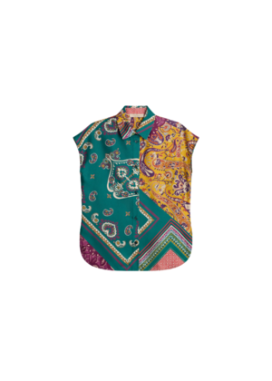 Short-sleeve blouse with a graphic, patchwork-inspired print. Crafted from a viscose and silk blend for a soft, fluid drape. Classic shirt collar for a polished, tailored feel. Straight, relaxed cut that sits easily on the body. The lightweight fabric transitions easily from day to evening and is designed for effortless styling with denim, tailored trousers, or skirts. Fabric: Viscose and silk blend. Care Instructions Dry clean recommended to maintain fabric quality. If hand washing, use cold water and mild detergent. Do not wring or twist delicate fabric. Lay flat or hang to air dry. Store away from direct sunlight to preserve color and texture.