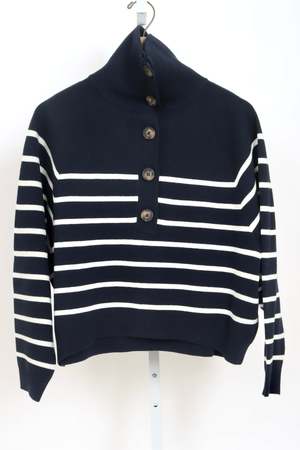 A fluid and structured piece that combines comfort and character with its buttoned stand-up collar. Striped cotton and wool knit sweater Buttoned stand-up collar Straight cut Contrasting striped pattern Long sleeves Main Material: 50% Cotton 50% Wool.