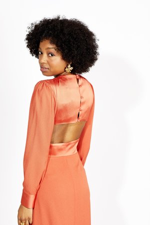 Delicate and sophisticated. The Henrietta Dress designed by Vanessa Cocchiaro features the most unique details from it's buttoned neckline, open-back, and exaggerated crepe front bow. Be sure to stand out, the perfect dress for all of your wedding events. DETAILS: - 76% Acetate 24% Viscose SIZE + FIT: - True to size