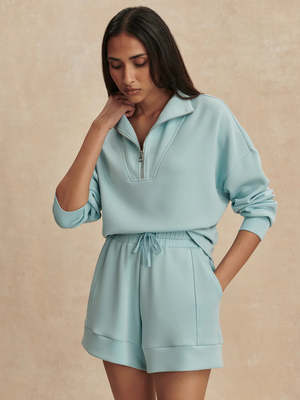 The Atrium shorts are made in Varley's signature DoubleSoft fabric and feature an elegant A-line cut. Perfect for spring/summer and daily wear, these shorts pair effortlessly with knitwear and matching DoubleSoft tops, and feature a dipped drawcord and deep hem panel for added style. The Atrium is cut for a high-rise, A-line fit. Take your true size. Studio model is 5'9.5", with a 32" bust, 23.5" waist, and 36" hips, and wears a size small. Size S - Front Rise: 13". Waist: 13.6". Inseam: 4.5". 72% Viscose, 23% Polyester, 5% Elastane. Machine wash cool, do not bleach, do not tumble dry, cool iron, wash with similar colours, turn inside out before washing, tie cords before washing, remove promptly from washer, and dry flat.