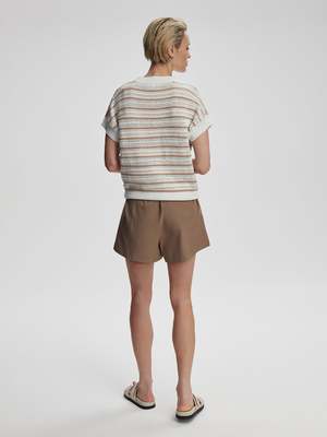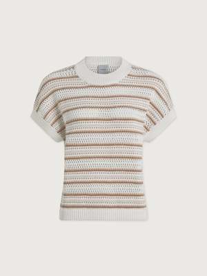 The Ciara is made from a cotton-blend yarn. The mix of pointelle and stripe stitching give intricacy to this wardrobe staple. The drop shoulder design and grown-on sleeves add a contemporary twist. Fabric: 60% Cotton, 40% Polyester Dry clean only, do not bleach, do not tumble dry, low heat iron, dry flat. Measurements: Front Length: 22" Model is 5'9.5" and is wearing a size Small.