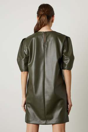 Ashlee is chic, yet classy, with a rocker edge! Crafted from a vegan leather, this pop-on dress, with a back clasp closure, features a touch of volume in the sleeve, with pleating and a seam detail. The body is classy, yet minimal in detail, with a bold double seam outlined side slit pocket. She's a perfect example of less is more. - Fits true to size - 100% Polyurethane - Machine wash - Made in the USA