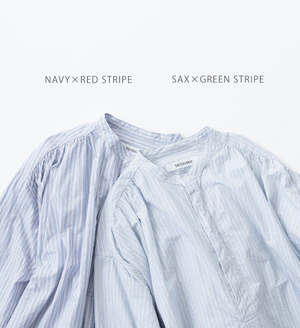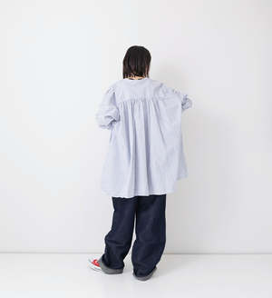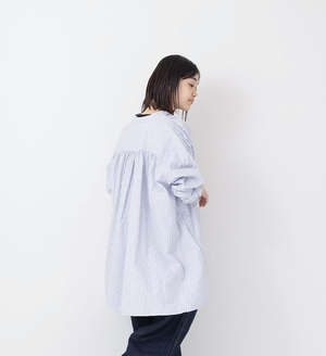 A pullover shirt with an A-line silhouette and fine gathers on the front and back for a roomy body. Comes with side pockets. Made from 100% long-staple organic cotton, this typewriter stripe fabric has a dry touch and a natural, fluffy, washed texture. Made in Japan Size (Free): Length 79cm, Chest width 70cm, Shoulder width 76.5cm, Sleeve Length 46cm, Armhole 50cm, Cuff width 11cm. Model: 162cm.
