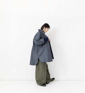 This long shirt from Veritecoeur is made from a high-density plain weave denim material. The smooth, compact yarn with little fuzz is dyed using a rope dyeing method that leaves the inside white, allowing the fabric to fade beautifully with repeated wear. This long shirt has a simple, timeless design. The loose fit gives it a relaxed feel. Size (FREE): - Length: 84 cm front, 91 cm back - Chest width: 66 cm - Shoulder width: 61 cm - Sleeve length: 45 cm - Armhole: 50 cm - Cuff width: 12 cm - Hem width: 67 cm (approx.) About Veritecoeur Veritecoeur is a Japanese brand based in Fukuoka, Japan. Named after the Latin meaning "true of heart," Veritecoeur is well-known for its natural materials and creative, versatile, comforting layers. As you wash the garments over and over again, they develop a nicer appearance and a pleasant texture.
