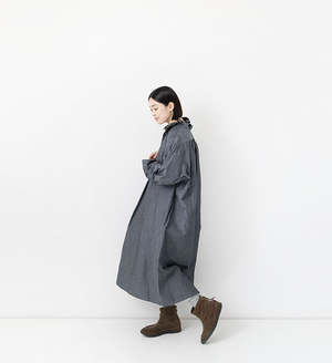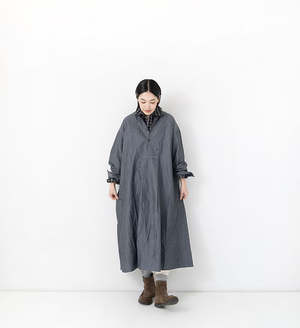 About Fabrics This dress is made from a high-density plain-weave denim. The smooth, compact yarn with little fuzz is dyed using a rope-dyeing method that leaves the center white, allowing the material to fade beautifully with repeated wear. About the Item This dress is reminiscent of a vintage dress shirt, with a front bib and a narrow yoke at the back. The body and sleeves are roomy, making it easy to wear every day. Size (Free) Length: 119.5 cm Chest width: 69 cm Shoulder width: 53 cm Sleeve length: 54 cm Armhole: 60 cm Cuff width: 11.5 cm Hem width: 91 cm About Veritecoeur Veritecoeur is a Japanese brand based in Fukuoka, Japan. Named after the Latin meaning "true of heart," Veritecoeur is well-known for its natural materials and creative, versatile, comforting layers. As you wash the garments over and over again, they develop a nicer appearance and a pleasant texture.