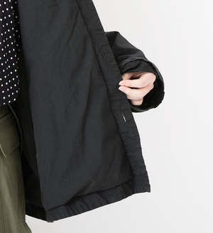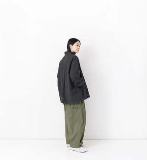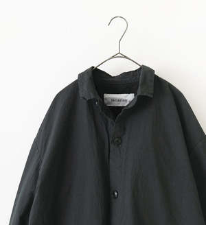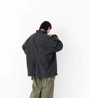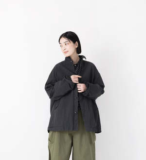 This shirt jacket is made from a crisp cotton-silk broadcloth fabric. The warp threads are made of smooth combed cotton, and the weft threads are a cotton-silk blend, giving the fabric suppleness and a pleasant, smooth feel. Using high-quality yarns for both the warp and weft allows for a higher-density weave than regular broadcloth, resulting in a crisp texture. The lining is also made of cotton broadcloth. This shirt jacket has been garment-dyed to give it a washed-out look. It features a two-layer construction with a cotton lining. The front, hem, and cuffs are finished as simply as possible for a lightweight and comfortable feel. 92% cotton; 8% silk. Made in Japan. Model: 176 cm Free size (one size fits all) FREE: Length 72 cm, Width 69 cm, Shoulder 58 cm, Sleeve 54.5 cm, Armhole 52 cm, Cuff Width 16 cm, Hem Width 67 cm.