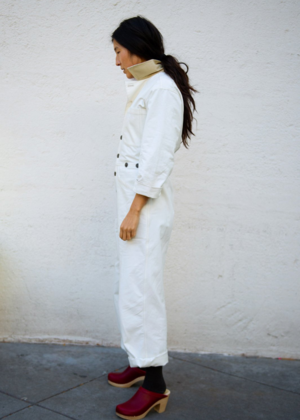 - White boiler suit - 100% cotton - Contrast colors at under collar and sleeve cuff - Front button closure Our Pre-Rented pieces are part of our Brooklyn shop rental program. They are all eco-friendly cleaned and like-new SIZE NOTES - S fits size 4-6, M fits size 6-8, L fits size 8-10 - Model is 5'4", size XS wearing a size S - S has 36" bust, 29" waist, and 38" hips, M has 40.5" bust, 32" waist, and 40" hips SUSTAINABLY MADE - From Verity & Daughters (New York, New York) - Sustainable Values: #3: Sustainable materials, #7: Safe, livable, dignified employment, #9: No animal cruelty SUSTAINABLE CARE - Hand wash cold - Do not bleach - Line dry - Cool Iron - Do not tumble dry