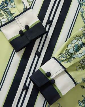 An ultra-feminine take on the classic shirtdress, the Carstowe mini dress by Veronica Beard is cut from a soft, silky twill and features a fluid, relaxed silhouette. It showcases a lush, scarf-inspired botanical print in ivory, pistachio green, and black. Black-and-white stripes along the trim and yoke add graphic contrast, while a clean band collar completes the look. Wear this long-sleeve dress from day to nightjust swap flats for heels and add a bold lip. - Shell: 100% Polyester - Lining: 100% Polyester - Dry clean only - Style #2603FL7522542 Size + Fit: Length 33.5" | Sleeve length 31.75", based on a size 2. Our model is 5'10" and is wearing a size 2.