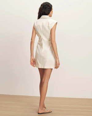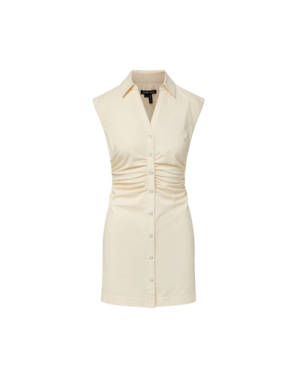 Crafted from premium chambray in ecru, the Maura shirtdress is cut in a slim, mini silhouette. Designed with a pointed collar and cap sleeves, it features a deep V-neckline and a partially functional button-down placket. Side ruching at the waist defines the shape, while a hidden side zipper adds ease. Chic and versatile, style it with sandals or heels alike. - 100% Cotton