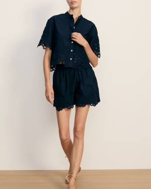 The classic button-down, made feminine. Cut from crisp cotton poplin, the Aleck shirt contrasts a relaxed, boxy silhouette and clean band collar with scalloped lace embroidery on the sleeves and lower body. Mother-of-pearl buttons complete the look. Style with the coordinating Vivaldi short for an effortless warm-weather set, and finish with strappy flat sandals.