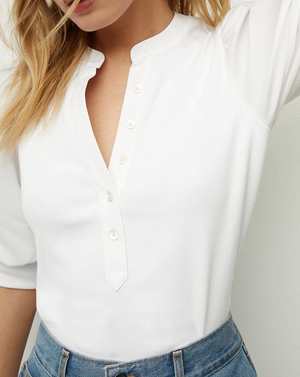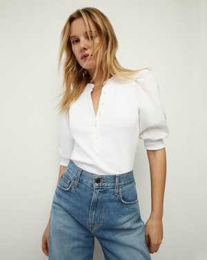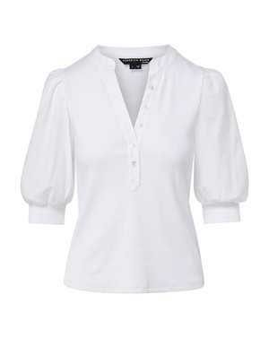The Coralee top by Veronica Beard is a feminine take on the classic button-down shirt. This T-shirt features short puff sleeves, a split V-neck collar, and a half placket for a refined finish. The body fabric is stretchy. The short puff sleeves are made from shirt fabric and finished with an elastic band. Hip-length. Sleeve length: 21 1/4". Body length: 23". Model is 5'10" and wears size S. Machine wash cold. 97% cotton, 3% elastane.