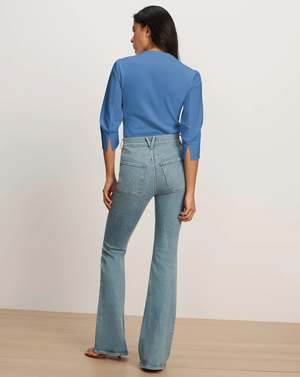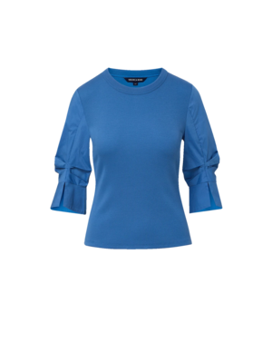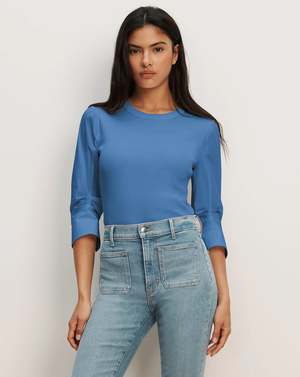 The Junia top from Veronica Beard combines the ease of a T-shirt with the structure of a button-down. This blue mixed-media style features the body of a relaxed T-shirt in soft, ribbed pima cotton and the crisp cotton sleeves of an Oxford shirt, complete with roll-up cuffs. A clean crew neckline completes the look of this elevated essential. Wear it solo or as a versatile layering piece. Fabric: 96% Cotton, 4% Elastane.