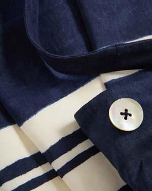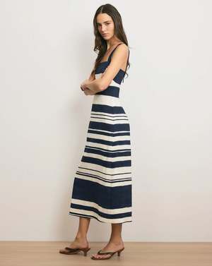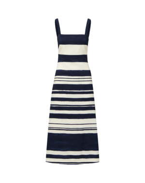 The Ella midi dress from Veronica Beard is crafted from a crisp linen blend and cut in a slim A-line silhouette. It features navy-and-white stripes with a hand-painted look. Wide, adjustable shoulder straps create a square neckline and are finished with shell buttons for subtle dimension. Perfect for date nights and weekends around townjust add a sandal and go. - 55% Linen, 42% Viscose, 3% Elastane - Lining: 100% Cotton - Closure: Back zip - Dry clean only - Style #2603LN3221406 Size + Fit: - Length 50.75", based on a size 2 - Model is 510 and is wearing a size 2