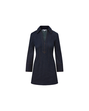 A refined take on the denim dress. Crafted from Veronica Beard's signature Stretch Denim Tailoring in dark blue, the Raymond features a flattering fit-and-flare silhouette, accented by angled bodice seams to define the waist. A collared split neckline, buttonless half-placket, and subtly flared long sleeves add a polished finish. Ever-versatile, it pairs with tall boots, heels, or flatsdress it up or down with ease. 75% Cotton, 23% Polyester, 2% Elastane. Dry clean only.