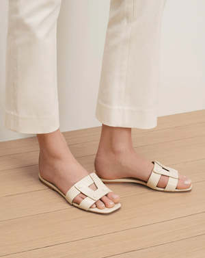 The Via slide sandal by Veronica Beard is the quintessential sandal every wardrobe needs. Expertly crafted from ecru leather with a shiny patent finish, this open-toe slide features a minimal multi-strap silhouette accented with cohesive hardware. Equal parts polished and effortless, its the shoe that goes with everythingfrom day to night and week to weekend. - Leather - Lining: Leather - Heel height: 0.375" - Type: Sandal