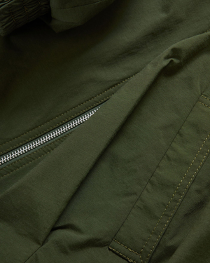 A go-to for transitional dressing. Crafted from army green faille, the Circe jacket features a cropped, bubble silhouette for a modern feel. Softly gathered at the front and back hem, its designed with a funnel neckline and elasticated blouson sleeves for subtle volume. Side welt pockets complete the look. Cut for a relaxed, oversized fit, it layers seamlessly over any outfit. Care guide 69% Polyamide, 25% Cotton, 6% Elastane Lining: 100% Polyester Made in the USA Dry clean only.