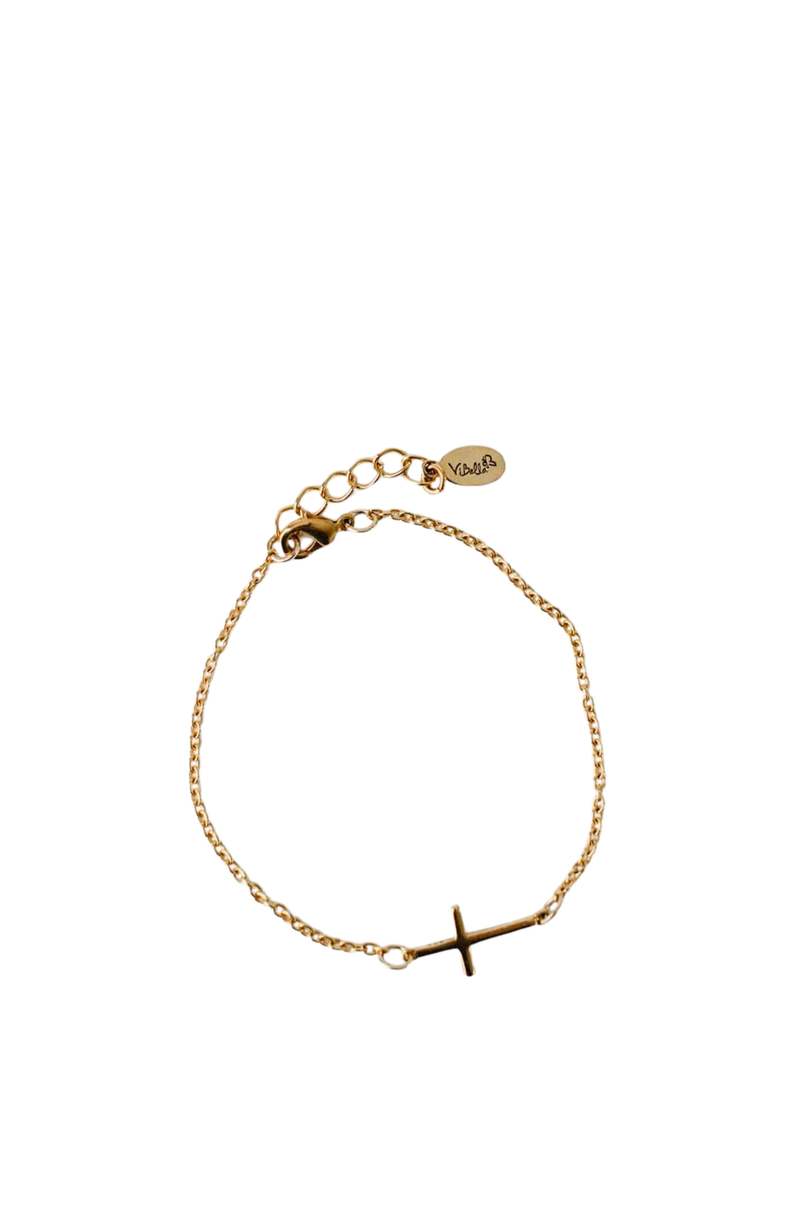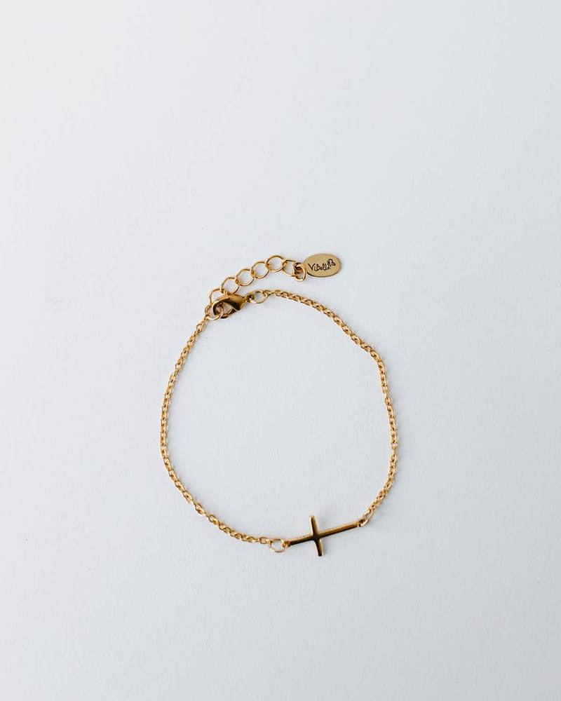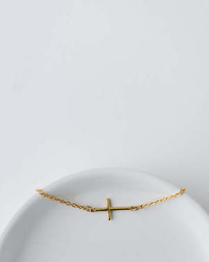 The Faith Bracelet is a fine chain bracelet featuring a sideways cross charm. The chain is crafted from gold-plated brass for everyday wear, and the sterling silver cross charm is plated with 22kt gold, offering a subtle gleam. This bracelet is handmade in Haiti by artisans, supporting fair employment within the community. The design includes an adjustable fit, with a 6.5-inch chain and a 2-inch extender, allowing for personalized comfort and styling. Its minimalist aesthetic makes it suitable for daily wear or for layering with other pieces. 6.5-inch chain with a 2-inch extender for adjustable wear. Sterling silver cross charm with 22kt gold plating. Gold-plated brass chain for durability. Handmade in Haiti, supporting artisan employment.