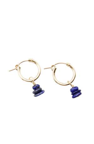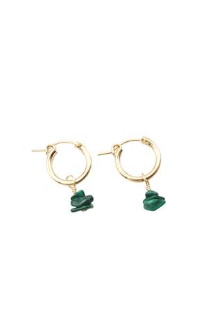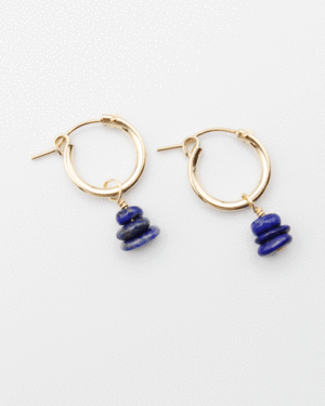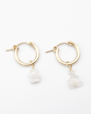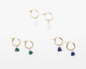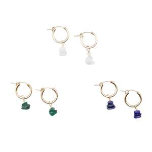 The Adriana Earrings are small hoop earrings crafted from 14k gold-fill with removable semi-precious gemstone chip dangles. The dangles can be detached, allowing the hoops to be worn as a simple, standalone piece. Available gemstone chip dangles include moonstone, lapis lazuli, and green malachite. Each pair is handcrafted in Mexico by artisan Adriana, reflecting attention to detail and quality construction. The lightweight design ensures comfortable wear for extended periods. Details: - 13mm 14k gold-filled hoop - Removable 0.5" raw gemstone chip dangle - Available in moonstone, lapis lazuli, or green malachite - Handcrafted in Mexico