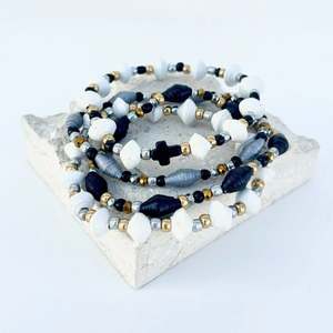 The Mirielle Paper Bead Bracelet Set features hand-rolled beads crafted from recycled newspaper, making each piece meaningful and unique. Designed in a versatile palette of black, white, silver, and gold, these bracelets complement a variety of outfits. These bracelets can be worn stacked together, one at a time, or mixed and matched for a personalized look. Details: - Gold, silver, and black smooth and faceted spacer beads - White, silver, and black paper beads made from recycled newspapers - Stretch cord - One size fits most - Handmade in Haiti by Vi Bella artisans