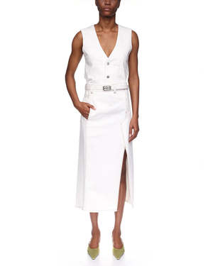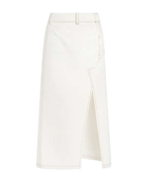 The Asymmetric Utility Skirt in Washed White by Victoria Beckham is a white denim skirt featuring a twisted, asymmetric design with tobacco topstitching, a back patch pocket, and side seam pockets. - Splits at front and back skirt - Back patch pocket - 100% Cotton - Machine wash at 30C - Made in Italy - #1325DSK006587A