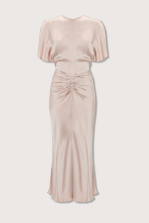 Modern refinement defines the Gathered Waist Midi Dress in delicate Blush-Apricot. Crafted from a lightweight fluid fabric with a jacquard flower weave, it has a feminine drape that falls into a classic fit-and-flare silhouette, a ruched front, tulip sleeve detail, and gentle V-neck at the back with a longer-length hemline. Exposed seams and contrasting topstitch add contemporary talking points. - Fits true to size, take your regular size - Midi length - Round front neckline, v-shape back neckline - Pleat detail on front waist - V-shape back waist seam - Fitted around the waist and hip - Exposed seams and contrast topstitching details - Concealed zip with hook and eye closure at back - 51% Viscose 49% Acetate - Dry clean only - Made in Portugal