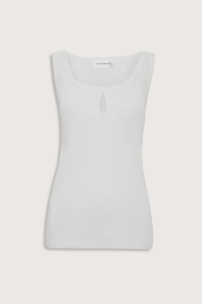 This split tank top features a rounded square neckline, cut-out detail, and a low hip length. It is sleeveless with a pleated back and made from a cotton-linen blend. 70% Cotton 30% Linen Made in Portugal.