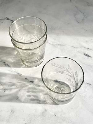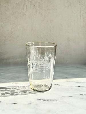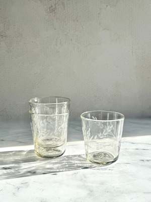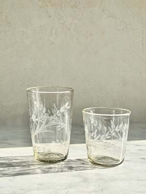 A functional and stackable tumbler. Handblown from recycled glass and hand-etched with a floral design, this lovely vessel brings charm and character to the table. Please note: Due to the handmade nature of this item, variations in design and size, as well as slight imperfections, may occur, including air bubbles, black specks, pontil marks, hand-tooling marks, and glass or color pattern irregularities. These imperfections are part of the handmade craftsmanship. - Available in two sizes: Medium: approx. 3.5" Dia x 4" H Large: approx. 3.5" Dia x 5.5" H - Sold individually - 100% Recycled Glass - Food safe - Size and shape will vary by approximately 1/2" from piece to piece.