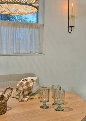 Due to the handmade nature of this item, variations in design and size, as well as slight imperfections, may occur, including air bubbles, black specks, pontil marks, hand-tooling marks, and glass or color pattern irregularities. These imperfections are part of the handmade craftsmanship. - Size: Approx. 3" Dia x 5.5" H | 10 oz - Sold as a set of two - 100% Recycled Glass - Food safe - Size and shape will vary approximately 1/2" from piece to piece.