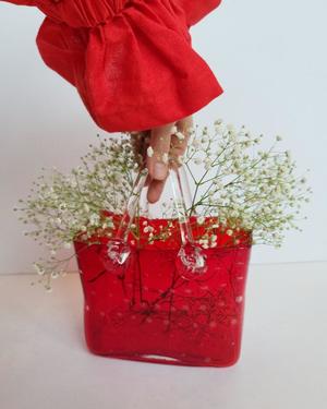 Vintage strawberry glass purse with bubbles pattern! Fill with cascading florals. Measures 6" tall, 9.5" tall with handles, 7" wide, and 3.5" deep.