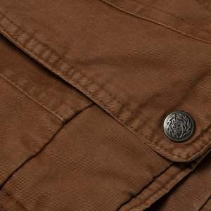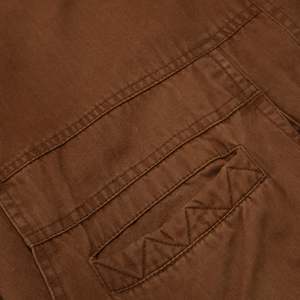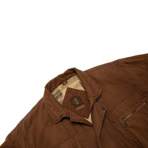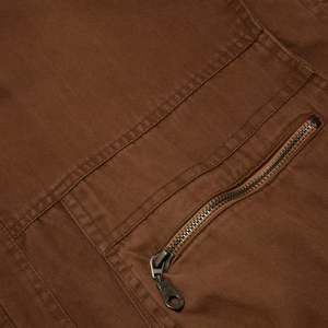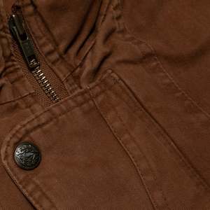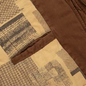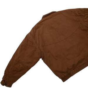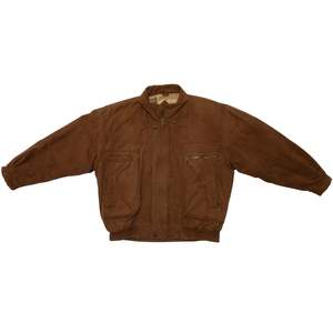 This vintage bomber jacket is a rugged, workwear-inspired outerwear piece crafted from heavyweight, durable cotton fabric in a warm brown tone. The utilitarian detailing and subtle military influences contribute to its heritage aesthetic, drawing inspiration from classic 80s and 90s military surplus and workwear designs. Designed for both function and style, this jacket features a slightly oversized, relaxed fit with dropped shoulders and an elasticized hem, creating a blouson silhouette that enhances comfort and mobility. Constructed from 100% cotton, this jacket features a right-hand twill (RHT) weave, known for its durability and structured texture. Weighing approximately 12-14 oz per square yard, the fabric ensures longevity while maintaining breathability. The worn-in softness suggests enzyme washing or garment dyeing, enhancing its vintage appeal. The partial lining is crafted from printed cotton canvas, showcasing abstract geometric and houndstooth patterns, adding an unexpected artistic contrast to the rugged exterior. The jacket employs flat-felled seams on major panels, reinforcing durability and preventing seam fraying. Topstitching throughoutparticularly at stress points such as pockets and shoulder seamsenhances structural integrity. A double-stitched armhole construction further increases strength and wear resistance. The multi-panel construction provides an ergonomic fit, with a curved yoke panel at the back to enhance mobility and reinforcement. Darted shoulders are integrated into the design to allow for ease of movement. The stand collar features a snap-button closure, offering protection against wind, while its reinforced double-layer construction ensures longevity and structure. The raglan sleeves, designed with paneling, provide an extended range of motion, and the adjustable snap cuffs allow for customized wrist fitment. The elasticized waistband is reinforced with ribbed knit on the interior, contributing to the classic bomber shape. Bound interior seams complete the clean, high-quality finish. The jackets heavy-duty brass zipper, likely from YKK, includes an oversized pull tab for easy grip, making it practical for everyday wear. A storm flap with snap buttons overlays the zipper, enhancing wind resistance and weather protection. Functional pocketing is a key highlight of this design, featuring two large patch pockets with flap closures and snap buttons, reinforced with triangular stitching for added strength. One horizontal zippered chest pocket, ideal for secure storage. An additional hidden interior pocket for discreet storage of valuables. Distinct zigzag topstitching on pocket flaps reinforces edge durability while adding a subtle, decorative touch. Decorative metal buttons with engraved motifs further enhance the jackets vintage character. This jacket draws inspiration from classic workwear, military surplus, and outdoor wear, blending functionality with a rugged aesthetic. The weathered, utilitarian design emphasizes durability and practicality, while the printed lining introduces a bohemian, artistic contrast, elevating the jackets visual interest. Color psychology plays a role in its appealearthy brown tones evoke warmth, reliability, and resilience, reinforcing the hard-wearing nature of the garment. The oversized fit and heavy fabric further communicate a sense of security and durability. Functional elements such as utility pockets and reinforced stitching highlight the jackets practical intent, making it both fashionable and highly wearable. This utility bomber jacket reflects late 80s to early 90s fashion, when structured, durable outerwear gained popularity in workwear, subcultures, and casual streetwear. Its heritage military and workwear references align with modern trends in vintage revival and heritage-inspired streetwear. In contemporary fashion, vintage-inspired bomber jackets remain highly relevant, aligning with slow fashion and high-quality craftsmanship movements. The combination of durable materials, functional detailing, and unique lining patterns makes this piece particularly appealing to collectsors and vintage enthusiasts.