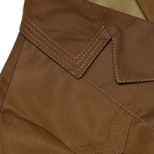 Flat-felled seams, five-line topstitching, and structured interfacing evidence disciplined Eastern Bloc manufacturing. The mid-length single-breasted overcoat, originating from the Vitosha Factory ( ) in Sofia, Bulgaria, emerges from the industrial apparatus of the socialist era, where garment production served as both infrastructural necessity and ideological reinforcement. Vitosha, operating under the Ministry of Light Industry, functioned not as a designer atelier but as a key manufacturer of structured garments for domestic and COMECON markets, imprinting its workwear-derived tailoring with the principles of socialist-modernist form: rigid construction, visual austerity, and pragmatic utility. The coat encapsulates this cultural moment, merging the visual coding of postwar functionality with engineered tailoring intended for urban and professional wear across fall and winter seasons. Constructed from a midweight cotton-polyester blend twill, approximately 220260 GSM, the fabric exhibits a high-density 2/1 or 3/1 twill weave, structurally analogo2us to gabardine. The surface shows a faint but consistent diagonal ribbings, revealing a weave engineered for abrasion resistance, wind buffering, and moderate weatherproofing, consistent with Eastern Bloc outerwear pragmatism. Internally, a smooth filament polyester or acetate satin lining (80100 GSM) facilitates mobility and thermal modulation, favoring slickness over insulation bulk. Fabric mill parallels can be drawn to Brisbane Moss, Limonta, Klopman International, and British Millerain, all historically renowned for producing similarly dense, performance-oriented twills with urban and industrial applications. In comparative textile terms, the shell structure aligns with heritage fabrics such as Burberrys cotton gabardine, military-grade Ventile, the vertically ribbed Bedford cord, and the steeper-grain Cavalry twill, reinforcing the coats lineage within technical outerwear traditions. The pattern architecture exhibits a highly rationalized panel configuration, designed for durability, surface flatness, and mass-producible grading scalability. Vertical princess seams replace conventional bust darts, carrying shaping through the torso without disrupting geometric continuity. Shoulder structures incorporate extended yoke panels, creating a faux-raglan illusion while preserving full set-in sleeve articulation. The back paneling, inferred from construction logic, likely employs a center seam flanked by vertical shaping seams to stabilize and scale the silhouette across production runs. The notched collar, sharply drafted and reinforced with layered interfacing, features a double-chevron topstitch motifa technical and aesthetic maneuver that balances tensile durability with graphic precision. Assembly methodologies are industrially disciplined. Flat-felled and topstitched seams dominate the construction, with no raw edge exposure, reinforcing both internal cleanliness and external visual order. Stitching density is consistent at approximately 910 SPI, executed via industrial-grade guide machines capable of maintaining uniformity across complex seam intersections. Topstitching acts as both reinforcement and visual codification: five parallel rows at pocket openings and collar edges provide structural integrity where strain concentrates, replacing traditional bartack reinforcements with planar strength distribution. Pocket construction utilizes double-welt or reinforced jetted techniques, stabilized with fusible interfacing and meticulously machined via specialized jigs, while the sharply turned and topstitched placket reflects the use of feed-off-the-arm machinery to control alignment on rigid, structured twill bases. Sleeve construction is inferred to be two-piece with moderate elbow shaping, allowing articulation without aesthetic compromise. Cuff tabs, featuring functional button adjusters, mirror the collar and pocket reinforcement motifs, creating a tightly organized visual language across garment components. Button anchoring, though not visually confirmed, is likely reinforced with cross-stitch threading and backing buttons, a standard technique in workwear-grade outerwear to prevent fabric rupture under tension. Edge finishing across the garment is uniformly clean and structurally sound. The hem treatmentdouble-turned and machine topstitchedcreates a sharply defined garment boundary, while inner seam allowances are likely overlocked and pressed flat in keeping with standardized mid-century Eastern European production protocols. The necklinemoderately deep and V-shapedbalances coverage with formality, culminating in a full placket closure stabilized through interfacing and button alignment, minimizing mechanical distortion over wear cycles. The psychological and semiotic dimension of the design is embedded within its rigid symmetry, tonal brown palette, and military-influenced detailing, projecting authority, collectsivism, and functional identity. The coat embodies the postwar ideal of the competent socialist woman: self-contained, mobile, and visually de-individualized. Its stripped-down formalism reflects socialist modernisms absorption of Constructivist principlesgeometric claritys, utility foregrounded as formand echoes the severe materiality of Brutalist architectural ideology. The V-shaped seam reinforcements at the shoulder and collar, executed through triple-line topstitching, abstract mechanical logic into visual form, collapsing structure and surface into a single expressive language. Historically, this coat is situated in the late 1970s to early 1980s, a period when Bulgarias state fashion apparatus began modestly absorbings Western stylistic influences within the bounds of controlled economic production. Material choices (poly-cotton blends), industrial seam finishing, and sober chromatic choices situate the garment within this hybridization phase. The Vitosha factory label anchors it firmly to state-sanctioned production, o