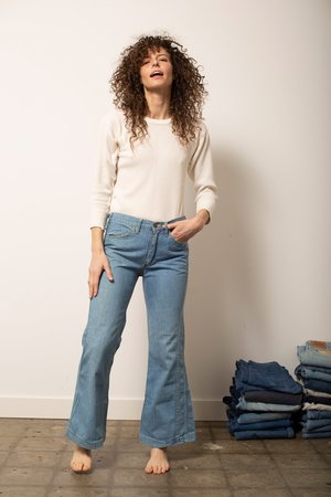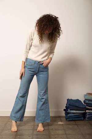 Vintage denim: conscious, casual, cool. - 100% cotton - Zipper fly - Made in the USA - Slim fit - Cropped Flare - Side panel - Butterfly Patch on the back right pocket Size + Fit - Fits like a Modern S - Waist 29" ( sits below the waist ) - Hips 38" - Inseam 29.5" - Rise 10" Our Vintage Items May show signs of wear as we believe this adds to the character of our pieces.
