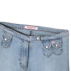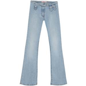 The flare is cut from pre-curved panels and sharply graded below the knee, amplifying movement and elongating the leg. Miss Sixtys low-rise bootcut jeans with decorative flap pockets encapsulate a distinctly early-2000s ethos, driven by hyper-feminine styling, engineered contouring, and a flamboyant interplay of embellishment and form. Launched in Italy in 1991 under Sixty S.p.A., the brand rapidly distinguished itself through its fusion of high-fashion European tailoring and aggressively trend-responsive denim silhouettes. These jeans are a direct artifact of that peak, merging low-rise construction, body-centric shaping, and surface ornamentation to construct a garment not only worn, but performed. From inception, Miss Sixty approached denim as a tool of visual provocation and anatomical enhancement. This pair illustrates that philosophy with precision: the contour of the waistband dips deeply at the front, elongating the torso and maximizing exposure of the hip linean aesthetic central to Y2K styling and emblematic of the brands cultural era. The narrow waistband, lightly interfaced and chainstitched, resists structural rigidity, allowing the jeans to sit flush against the hips without visual interruption. Flared from the mid-thigh and cinched through the knee, the bootcut silhouette exaggerates leg length and curvilinear movement, producing a kinetic aesthetic ideal for nightlife, street fashion, and body-conscious environments. The garments engineering prioritizes anatomical shaping over utilitarian strength. The rear yoke is subtlenearly sublimated by extended back paneling that eliminates the traditional yoke break linefacilitating a smooth, lifted seat shape. Seams throughout the garment are lockstitched, with inseams pressed open rather than flat-felled, favoring softness and flexibility over bulk resistance. This choice reinforces the garments tactile priorities: comfort, suppleness, and movement-friendly construction. The fly is bound with a zig-zag reinforcement stitcha non-traditional but fashion-forward solution, contributing both visual edge and flexibility without overconstructing the area. Flap pockets define the garments signature visual language. Situated atop slash-cut front pockets, these flaps are triple darted for articulation and reinforced with pearl-finish rivets, communicating both femininity and directional design. The choice to triple-rivet the coin area is unusualan intentional departure from classic denim utility and a signal of Miss Sixtys fashion-centric priorities. Rivet placement is symmetrical, cleanly aligned, and visually decorative, contributing more to surface tension and visual architecture than to stress dispersion. Fabric choice complements the visual ambition. The denimlikely 98% cotton and 2% elastaneis a lightweight 1011 oz/sq yd right-hand twill with stone-bleached finishing across the thighs. This wash pattern enhances the illusion of leg length and thigh curvature, leveraging fade mapping as both an optical device and a cultural cue. While the weave structure ensures twill durability, the relatively low GSM and elastane infusion prioritize fluidity and body conformance over abrasion resistance. Stretch yarns, most likely core-spun, provide medium recoveryadequate for the jeans tight-fitting intent, particularly across hip and thigh zones. The panel geometry is complex, yet expertly drafted. Waist shaping is achieved through deep dart manipulation at both front and back, integrating structural curve into the cut rather than relying solely on stretch. The inseam exhibits a pre-curved drafting approach, allowing the jean to follow the natural contour of the legfurther refining the body-hugging silhouette. The flare itself is constructed from a carefully graded taper below the knee, then abruptly widened to create a sweep that accentuates motion and visual rhythm. Edge finishing throughout reveals a preference for finesse. The hem is double-folded and lockstitched with minimal roping potentiallightweight, mobile, and visually discreet. Waistband edges are overlocked and topstitched, omitting inner facings or bias binding to maintain thinness and softness. Pocket bag interiors are plain-weave cotton, overlocked and moderately shallow, designed more for visual flattening than storage function. The back patch, a high-contrast faux leather applique in red, is secured with overlock stitching; a satin-stitched center tab adds brand distinction, functioning more as an aesthetic anchor than a practical label. Conceptually, these jeans manifest the dominant themes of post-clubwear femininity and early-2000s aesthetic maximalism. They channel cultural narratives surrounding hyper-visible sexualization, the display of the female form, and denims transition from utility to spectacle. The low-rise cut, flap layering, narrow waistband, and sleek fit are design maneuvers deeply embedded in a period defined by hyper-body awareness and celebrity-influenced styling. In psychological terms, the garment invites a mode of wear premised on controlled exposurecurated skin, contour emphasis, and overt brand signaling. Artistically, the jeans draw from a composite of military-influenced pocket geometries, feminine futurism, and streetwear embellishment. The decorative rivets, curved flaps, and sculpted seams form a kind of textile architecture that transcends utility. This is denim as signala fashion object that refuses neutrality, instead offering audacity through tailoring. The aesthetic is performative: meant not to recede, but to demand engagement, to operate within the visual economy of early-aughts glamour. In contextual terms, these jeans clearly date from Miss Sixtys peak commercial yearslikely between 2002 and 2005during which the brand was a dominant force in womens premium fast fashion across Europe and parts of Asia. Their construction, branding, and silhouette place them squarely in the Y2K cultural archive. The decorative emphasis and branding executionf