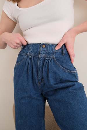These blue cotton denim jeans have a high-rise silhouette with a wide leg and a softly structured drape. Front pleats, curved hip pockets, and a button closure give them a sculptural, easy shape. Fits like XS. Measurements Waist: 26 in. Hips: 40 in. Rise: 13 in. Inseam: 27 in. Model is a US size 4 and stands at approximately 5 feet 8 inches. Although we do our best to ensure each item is in excellent condition, please respect any minor flaws due to the item's vintage character. Color may vary slightly due to lighting and screen settings. Measurements are approximate. Vintage 80s blue cotton denim jeans by Calvin Klein with a high rise, front pleats, and a wide-leg silhouette. Condition: Used.