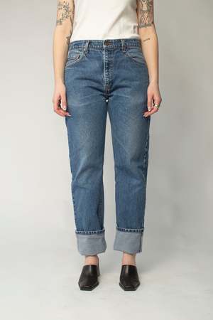 This pair of Levi's 505's fit is similar to a modern size M, see the Size & Fit tab for all measurements. - Zipper fly - Mid-rise, size up for a more low-slung look - Mid-Wash - 100% Cotton - Made in USA - Waist measures 33" - Great distressing and a long length Size fit Waist 33" Hips 44" Rise: 11.5" Inseam: 33"
