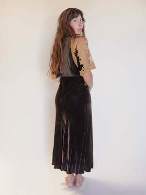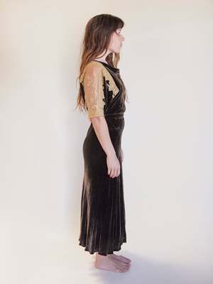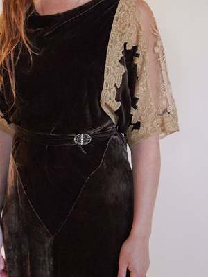 very rare 1920s batwing chocolate silk velvet dress with ecru lace detailing and antique buckle on belted waist. dress is cut on the bias for a body hugging, flattering loose fit. size: extra small-small all measurements taken flat: ptp: 17'' shoulder: 16'' waist: 16'' hip: 19'' length: 48-51'' color: chocolate material: silk velvet condition: great, some holes in mesh at top of shoulders, priced as-is Jess is an extra small All items are preloved or vintage so might show signs of minor wear. Anything major will be noted & photographed.