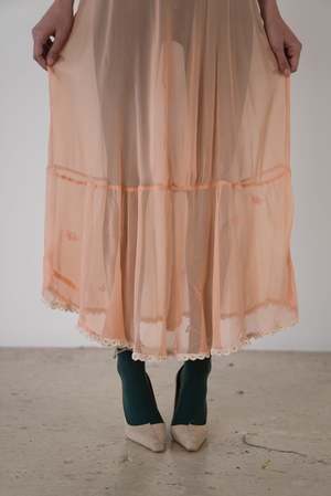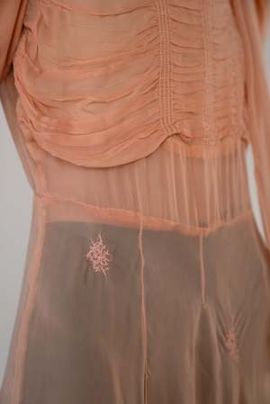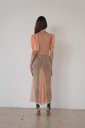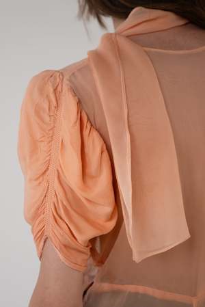 Color: Melon Description: A vintage sheer melon colored dress featuring a ruched bodice, shaped sleeves, and small embroidered accents throughout. Comes with matching sash. One-of-a-kind. Fabric Content: No label - feels like an early synthetic fiber. Size: Small. Care Instructions: We would recommend hand-washing in cold water with gentle detergent. Hang dry.
