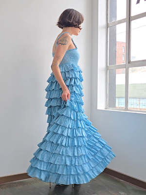 Pale blue polkadot ruffle maxi dress. Ruffled neckline with a zip up the side. Fully lined. Great condition. MEASUREMENTS (in inches) 29 in bust 26 in waist 40 in hips 57 in length MATERIALS Cotton All items are FINAL SALE. Vintage pieces are pre-loved and may come with minor flaws, condition will be noted in description.