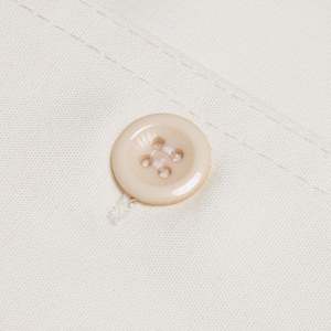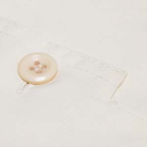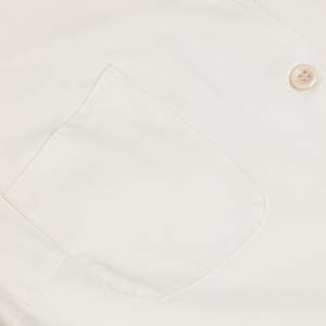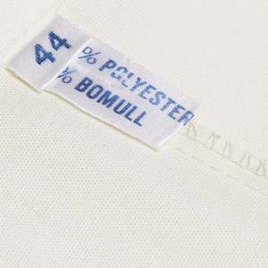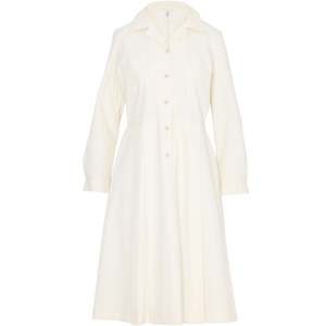 Structured with knife pleats, notched collar, and patch pockets, this long-sleeve shirt dress reflects Nordic institutional design from the welfare-era. It features a spread notched collar, chest patch pockets, full front button placket, and a flared A-line skirt assembled from symmetrically pleated panels. The silhouette emphasizes domestic neatness and social respectability, balancing functionality with tailored presence. Fabricated from a 65% cotton and 35% polyester blend in a fine plain weave, the textile offers breathability, moisture absorbency, shape retention, wrinkle resistance, and colorfastnessoptimized for industrial laundering and long-term wear. The fabric is lightweight yet substantial, maintaining opacity and drape integrity without requiring a lining. Construction details include bust darts into the armscye, a defined waist seam, symmetrical knife pleats below the waist, set-in two-piece sleeves gathered into narrow cuffs with button closure, an integrated stand collar with topstitching, reinforced front placket, and overlocked internal seams for durability. The dress channels Scandinavian ideals of institutional neatness and practical elegance. Its cream coloration connotes purity and domestic readiness while maintaining composure in public-facing roles. There is no decorative trim or surface patterning; aesthetic identity is conveyed through silhouette and proportion. Measurements (cm): Chest: 52 Length: 110 Shoulder: 41 Sleeve: 60