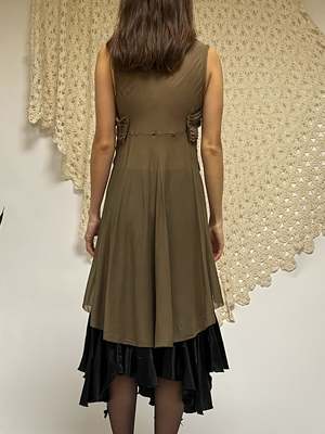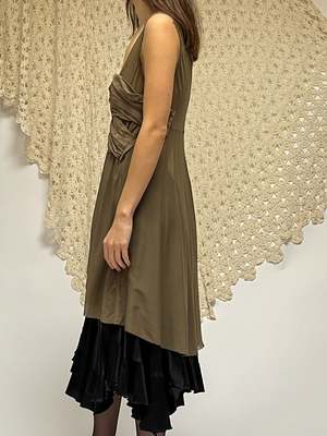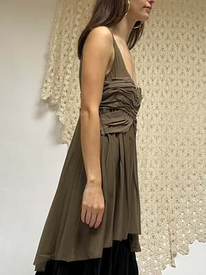 Vintage Y2K era Donna Karan light mocha brown midi dress. Sleeveless with a gathered bust and asymmetrical hem. A few small snags. MEASUREMENTS (in inches) 36 in bust 30 in waist 50 in hips ~33 in length MATERIALS Silk