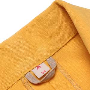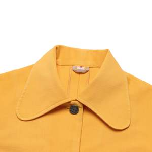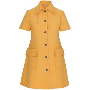 The 196871 Toni Lee yellow A-line mini dress fuses mod minimalism, pop color vibrancy, and precise pattern drafting into a dynamic daywear form. A product of late-1960s American ready-to-wear innovation, this button-front A-line mini dress encapsulates the energetic spirit of the era through both its design language and technical execution. Toni Lee forged a brand identity rooted in vibrant, youthful interpretations of mod and pop art aesthetics, bringing bold color blocking, pragmatic functionality, and clean architectural lines into accessible daywear. Within the American sportswear renaissance, the label played an important role in democratizing European-inspired mod silhouettes for the mass market, fostering a casualization of formalwear while maintaining stylistic precision. This garment is classified as a womens short-sleeve, button-front A-line mini dress intended for semi-formal daytime or casual professional settings. It features prominent patch pockets, sharp collar construction, and precise seaming for ease, utility, and structural polish. Construction employs a single-needle lockstitch throughout main seams with overlock seam allowances for fray resistance. The center-front placket features clean fold-over facings with meticulously spaced buttonholes stabilized with interfacing. Collar and upper structure benefit from lightweight interfacing for crisp drape and edge definition. Pattern engineering includes a sharply curved front yoke seam flowing into princess-seam shaping that forgoes traditional bust darts for smooth volumetric modulation. Semi-fitted sleeves are inserted with minimal cap ease for mobility without bulk. Patch pockets with flaps are crisply topstitched for graphic definition. Button hardware consists of textured gunmetal-tone discs that punctuate the dresss monochromatic field. The textile is a high-density plain weave, lightweight synthetic blendlikely polyester-dominant with minor natural fiber contentboasting a compact, slightly pebbled hand and semi-crisp finish for shape retention and crease resistance. The saturated yellow projects vitality and youthfulness, amplified by the modernist structure of the A-line silhouette and button-front engineering. Measurements (cm): Chest: 44 Length: 82 Shoulder: 38 Sleeve: 20 Size Conversion (approximate) US Womens Size: S EU Womens Size: 36 SKU: 015044