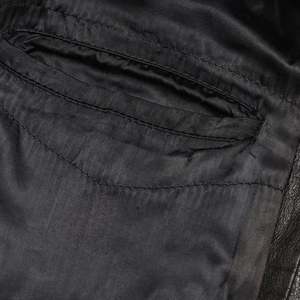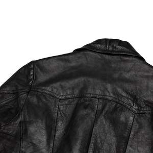Ergonomic two-piece sleeves, princess seams, and triple-yoke structuring optimize mobility, silhouette claritys, and upper-body articulation. This womens mid-length black leather utility coat was produced without a designer brand label and most likely originates from a West German manufacturer active between 1973 and 1978. It exemplifies the rigorous material authenticity and structural pragmatism characteristic of Central European midcentury outerwear manufacturing. Patterned with utilitarian logic, the coat features a four-button front closure, oversized collar, patch-and-flap hip pockets, and paneled construction optimized for durability and ergonomic movement. Its silhouette references mid-century military fatigue and field jackets, reinterpreted through a gender-integrated lens appropriate for the professional shifts of the 1970s. The exaggerated collar, modular seam architecture, and extended thigh-length cut harmonize utility with minimalist authority. The outer shell is composed of full-grain black leather, most likely chrome-tanned cowhide, with natural pebbling and a semi-aniline finish. The interior is fully lined with plain-weave black polyester for abrasion resistance and weight management. Construction includes flat-felled and topstitched seams for durability, with reinforced junctions at key stress points. Vertical princess seams shape the torso; a triple-seamed yoke enhances shoulder articulation; vertical paneling maintains a straight silhouette; and ergonomic two-piece sleeves ease motion at the elbow. The oversized collar is lightly interfaced to preserve structure. Sleeves and hem edges are turned and topstitched to stabilize leather expansion over time. Measurements (cm): Chest: 50 Length: 78 Shoulder: 42 Sleeve: 60 Size Conversion (approximate): US Mens Size: SM EU Mens Size: 4648 US Womens Size: ML EU Womens Size: 3840 SKU: 015041