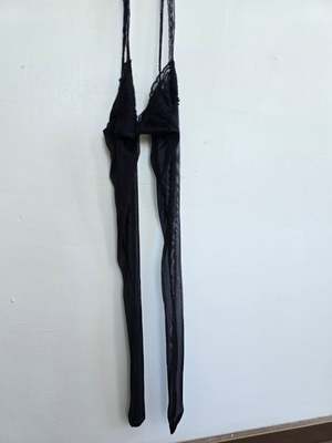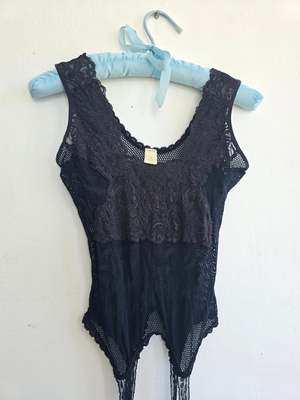 Incredible vintage Victoria's Secret gold label lace and fishnet mesh leotard with attached garter stockings. Stretchy lycra fabric. Amazing layering piece. Excellent condition. Marked size L. MEASUREMENTS (in inches) 32" in bust 24" in waist 59" in length MATERIALS 88% Nylon 12% Lycra All items are FINAL SALE. Vintage pieces are pre-loved and may come with minor flaws; condition will be noted in description.