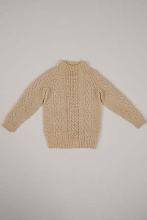 Cream 100% pure virgin wool cable knit sweater by John Molloy featuring a traditional Aran-style pattern with braided cables and textured knit panels. The dense virgin wool construction and ribbed collar, cuffs, and hem give the piece a warm, classic silhouette typical of heritage Irish knitwear. Made with quality in Ireland. Measurements: Shoulder: 12 in. Chest: 26 in. Sleeve: 14 in. Length: 19 in. Although we do our best to ensure each item is in excellent condition, please respect any minor flaws due to the item's vintage character.