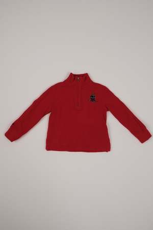 Classic childrens quarter-zip pullover by Polo Ralph Lauren in a vibrant red knit. The chest features the iconic Polo Ski Bear embroidered motif, adding a playful signature touch to this cozy everyday piece. Designed with a mock neck and quarter-zip closure for easy layering, this sweater is finished with ribbed cuffs and hem for a comfortable fit. Tag size reads 2/2T. Although we do our best to ensure each item is in excellent condition, please respect any minor flaws due to the item's vintage character. H8472.
